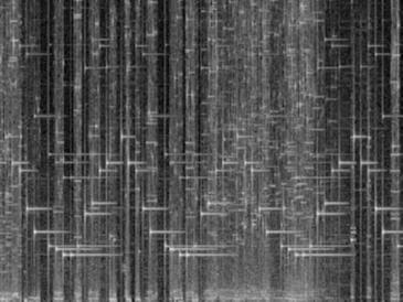 PlLux05 - AV digital prints on plastic, sounds, space, 2005 Production: Automata Description: Series of three sounds and fifteen visual units captured from these sounds. PlLux05 - AV is a a series of sounds and visual data captured from them. Three previously made sounds were converted into the three long stripes of visual data using software with Fast Fourier transformation. Those stripes were divided into equal squares, printed onto the plastic and stretched to wooden frames. The decision to do so came after converting audio material and after facing the complexity of visual structures, the sublime textures and the intensity of those data stamps. These works are about digital packages, messages and their traveling, perception, deciphering, and their translation in different realms.